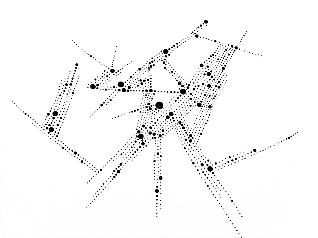 Me: One series that grew and grew on its own is what I call my ‘Connectivity’ drawings. They’re made up of dots interconnected in various ways, like mental maps. I spend a long time trying to make each dot as round as possible, without using a compass. I’m not sure why I do it that way; it’s very meditative work. Some people find them interesting, but they’re completely abstract, and I’m not sure they resonate. I enjoy showing my work, but when there’s no feedback, it can be discouraging. I know I shouldn’t seek external validation, but it is what it is.