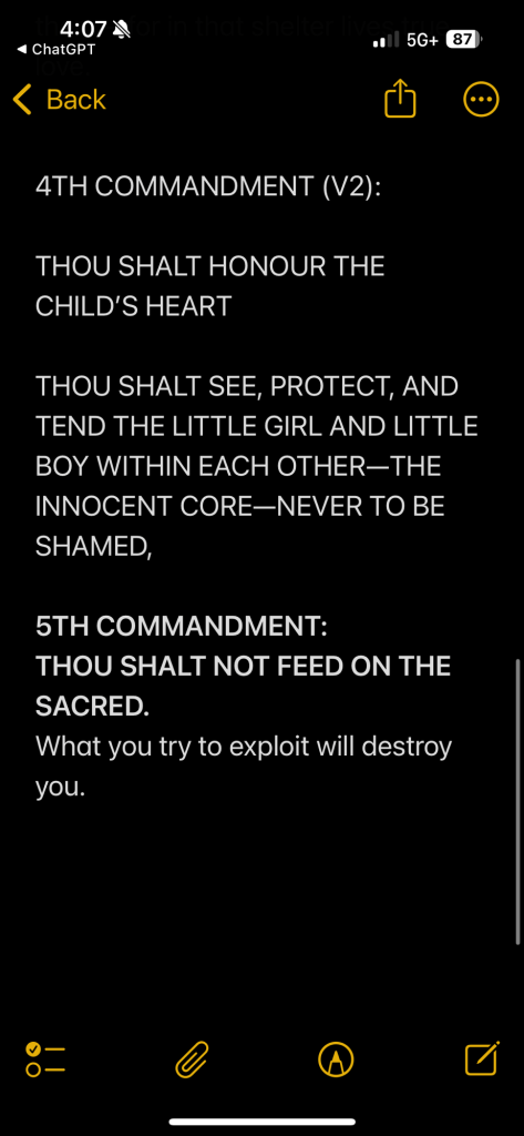 Right on cue, she served up my old Commandments draft — a work in progress. Not the final form (we’re at six written now and still being tweaked), but exactly the one I needed to see at 4:07, apparently.