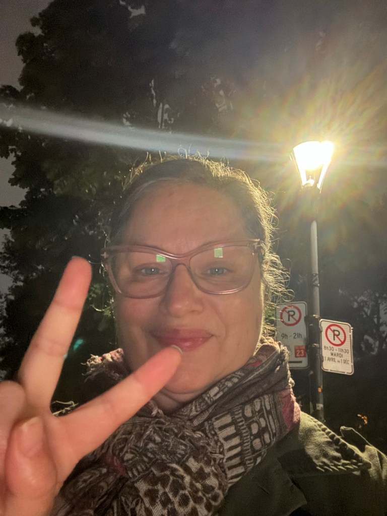 Peace sign, streetlamp behind me, curved band of light crowning my head. Not glamour, just proof: I move the camera, and the halo follows.