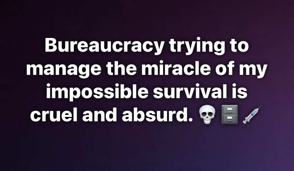 The fact I survived an impossibly high overdose of 1800 mg of codeine because I was severely depressed from all the societal and familial abuse I’ve been put through and that the system has decided to double down with a web of lies fabricated to get court-ordered antipsychotic injections forced on me while pretending I’m “obsessed with abuse” AS THEY ARE ABUSING ME is a perfect illustration of the fascistic system we are living in.