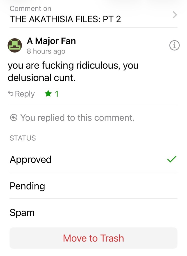 You can see the entire exchange in the comment section of my previous blog post titled THE AKATHISIA FILES: PT 2.