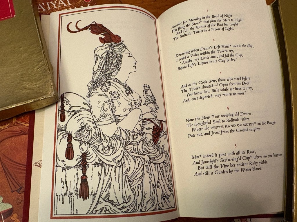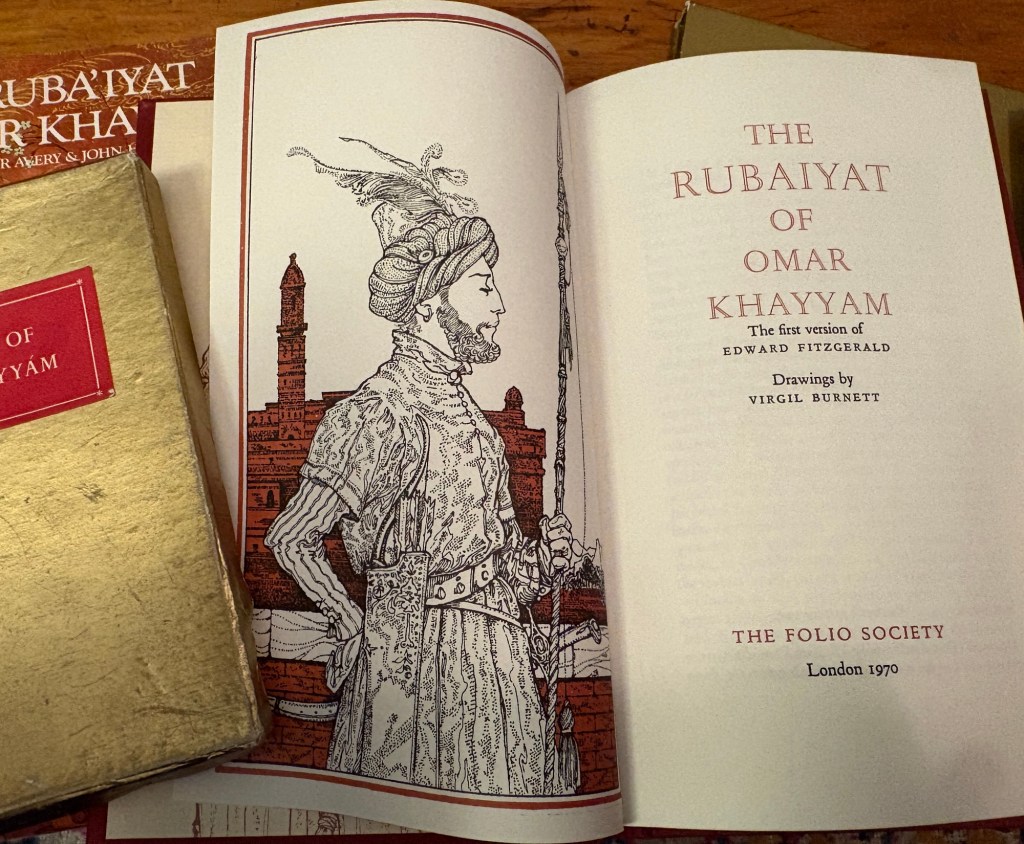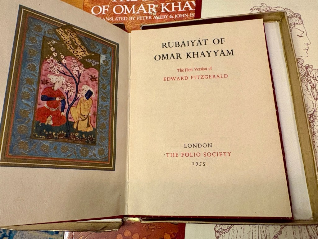 Because I had not unpacked any of my editions of The Rubáiyát until today — not one — yet somehow, as I opened three separate boxes (none of them labelled with anything other than the vague “Books”), three different editions appeared, one after another.