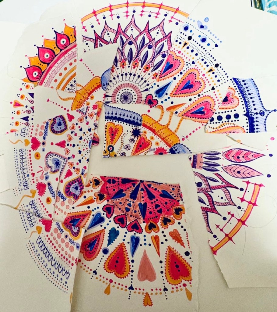 The three mandalas shown on this post were executed on photocopy paper while I was hospitalized in the summer of 2022, and somehow survived the purge of 2025 — even though I destroyed (among many other drawings of mine) a bunch of mandalas I did months later, back home. I had used a compass in a Moleskine A4 sketchbook in the fall of 2022 For those drawings, fragments of which survived (shown just below).